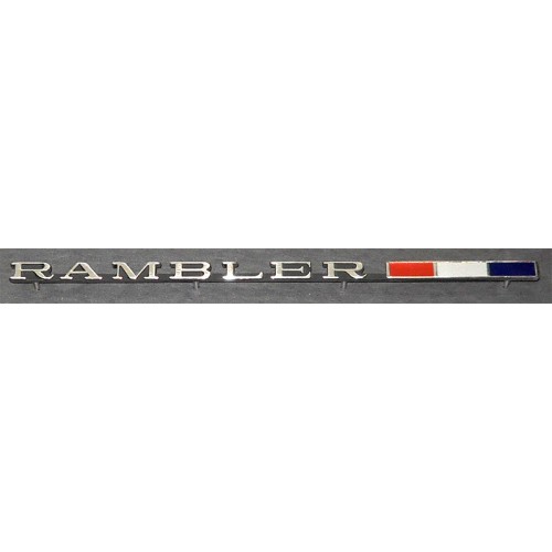 1969 RAMBLER NAMEPLATE WITH RED, WHITE & BLUE FLAG.