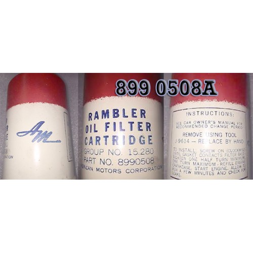 1958-1964 RED, WHITE, AND BLUE AMC ORIGINAL OIL FILTER IN ORIGINAL RAMBLER BOX. FOR 1958 THIS IS LATE PRODUCTION WITH SPIN-ON FILTER. THIS IS NOT USED ON THE 1961-64 ALUMINUM BLOCK 196 6 CYLINDER.