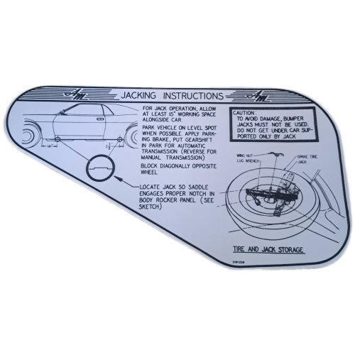 1968-69 JACKING INSTRUCTIONS DECAL FOR MODELS WITH A STANDARD SPARE TIRE, THIS IS LOCATED ON THE TRUNK LID.