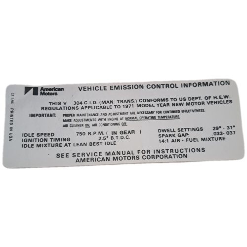 1971 304 V8 ENGINE COMPARTMENT EMISSIONS DECAL