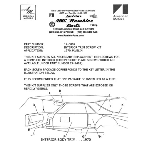 1970 JAVELIN INTERIOR SCREW KIT, 72 PIECES.