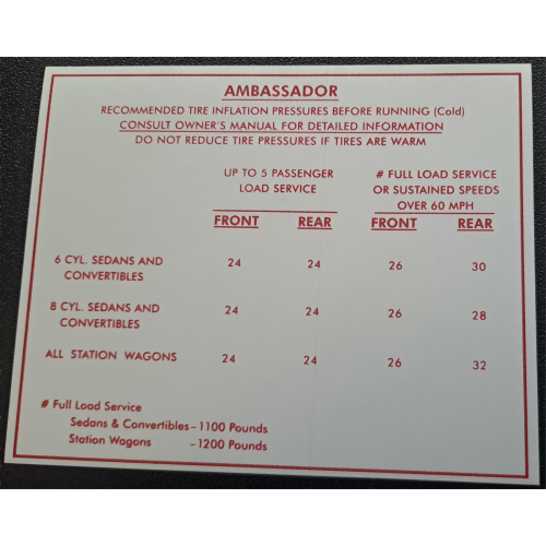 1966 AMBASSADOR TIRE PRESSURE DECAL