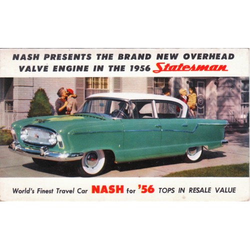 1956 NASH STATESMAN POSTCARD, 4-DOOR SEDAN WHITE OVER GREEN, UNUSED.