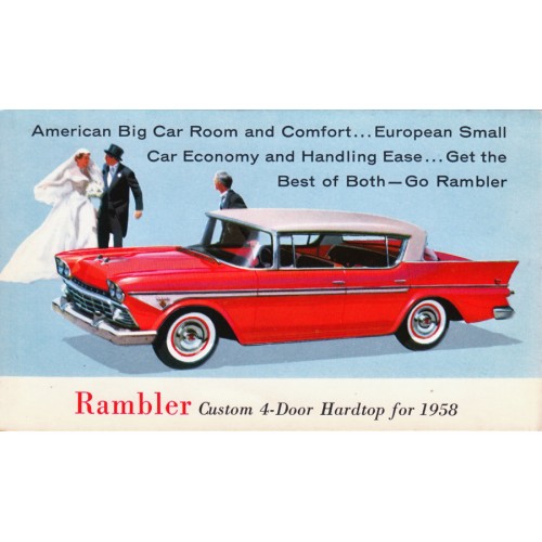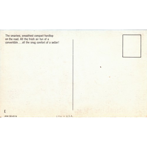 1958 RAMBLER 6 OR REBEL V8 CUSTOM 4-DOOR HARDTOP, 2-TONE WHITE AND RED, UNUSED POSTCARD.
