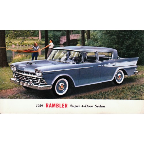 1959 RAMBLER SIX OR REBEL V8 BLUE SUPER 4-DOOR SEDAN UNUSED POSTCARD.