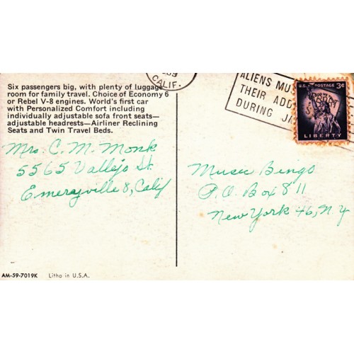 1959 RAMBLER SIX OR REBEL V8 WHITE CUSTOM CROSS COUNTRY STATION WAGON USED POSTCARD.