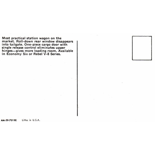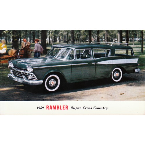 1959 RAMBLER SIX OR REBEL V8 GREEN SUPER CROSS COUNTRY STATION WAGON UNUSED POSTCARD.