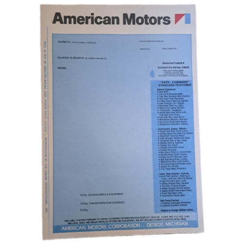 1970 BLANK WINDOW NEW CAR PRICE STICKER