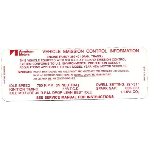 1972 360 V8 ENGINE COMPARTMENT EMISSIONS DECAL