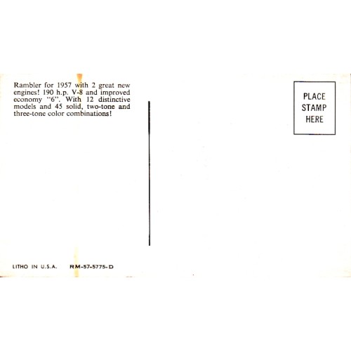 1957 NASH RAMBLER 6 OR V8 CUSTOM 4-DOOR HARDTOP SEDAN IN 2-TONE RED AND WHITE, UNUSED POSTCARD.